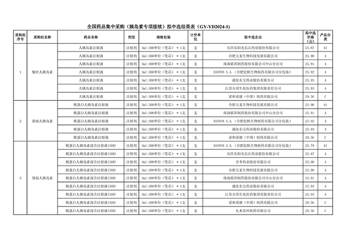 現(xiàn)將全國(guó)藥品集中采購(gòu)(胰島素專項(xiàng)接續(xù))(采購(gòu)文件編號(hào):GY-YD2024-1)擬中選結(jié)果進(jìn)行公示,詳見(jiàn)附件。